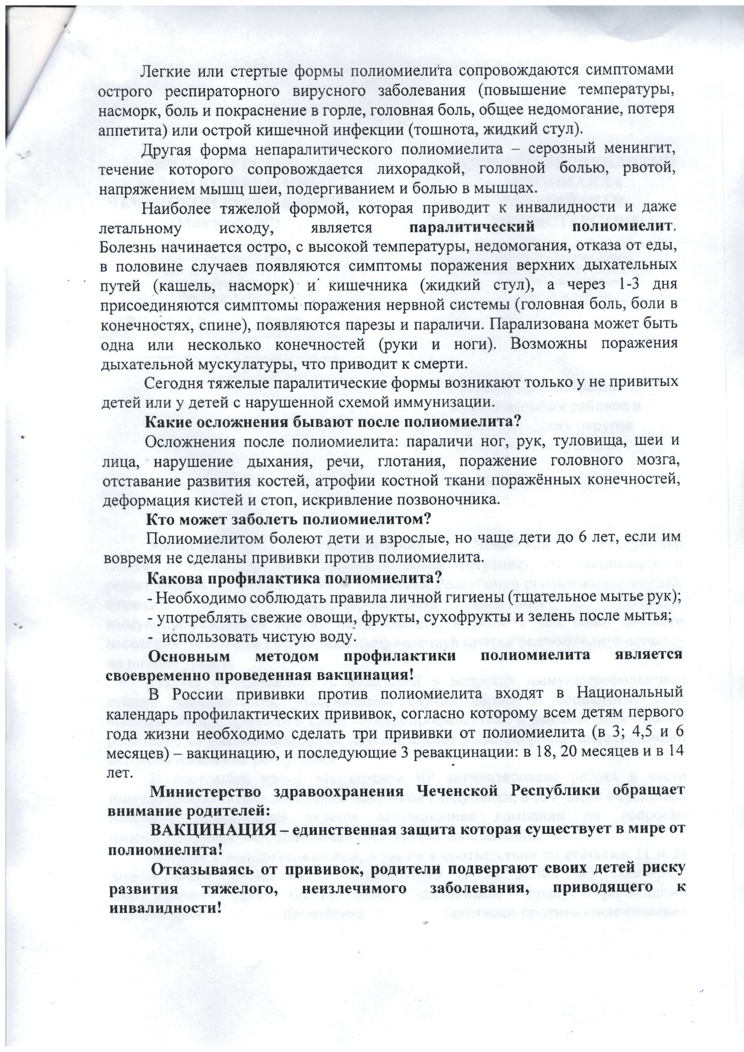 В настоящее время Минздравом ЧР активизирована работа в части иммунопрофилактики населения Чеченской Республики, в том числе в средствах массовой информации ведется агитационная компании по вопросам иммунопрофилактики полиомиелита и других заболеваний.