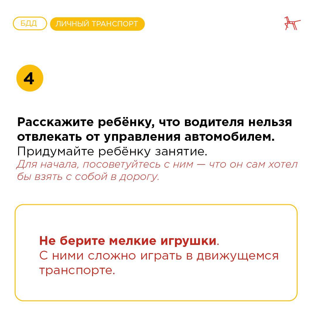 07.05.2024🚘 Как организовать безопасную поездку с ребёнком?На время праздников многие семьи отправляются в автопутешествия. Как организовать поездку, чтобы и родителям, и ребёнку было комфортно, рассказывает Центр по профилактике ДДТТ Института воспитания.Не забывайте, что во время стоянки запрещено оставлять ребёнка младше 7 лет одного в автомобиле: в тёплое время года он может перегреться. Об этом правиле также говорится в Уголовном кодексе Российской Федерации (статья 125). За его нарушение предусмотрен штраф или лишение свободы.