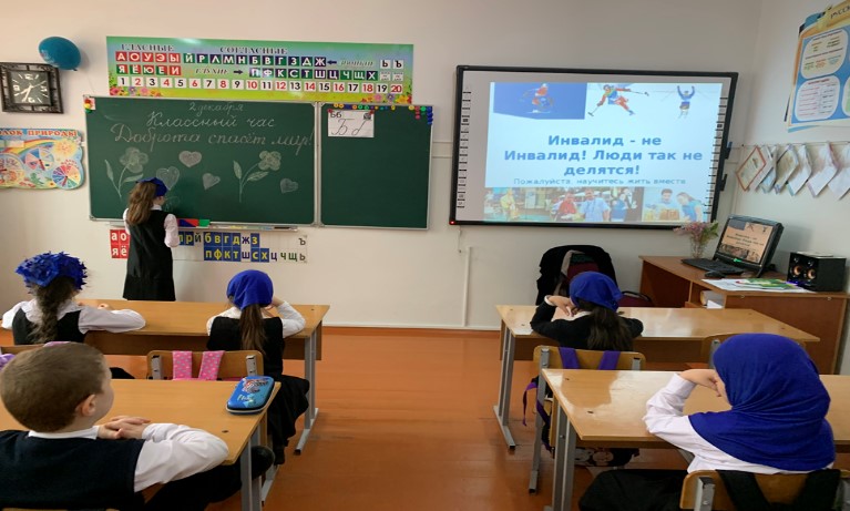 В рамках декады инвалидов 2 декабря 2024 года в МБОУ "СОШ п. Долинский" были проведены классные часы. Классный час в 1 «б» классе «Доброта спасёт мир».