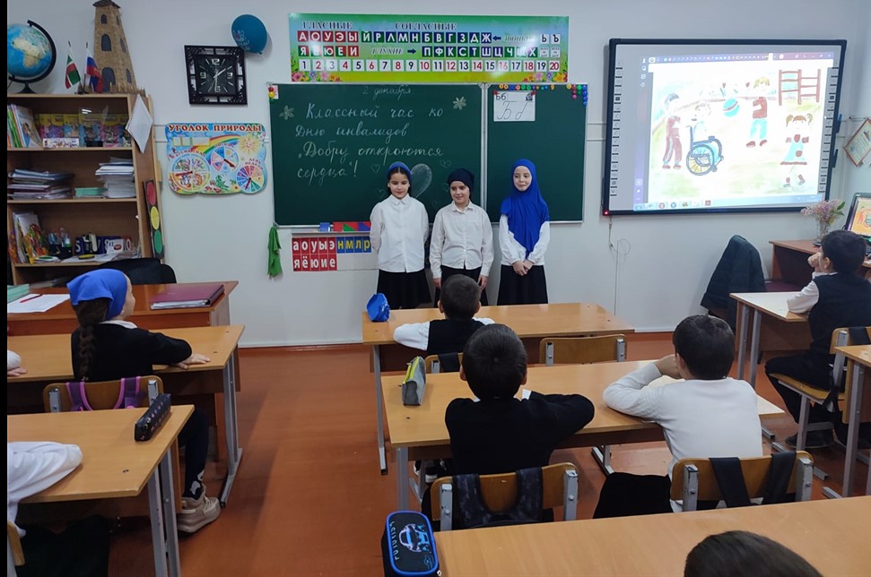 В рамках декады инвалидов 4 декабря 2024 года в МБОУ "СОШ п. Долинский" были проведены классные часы. Классный час в 3 «г» классе «Добру откроются сердца».
